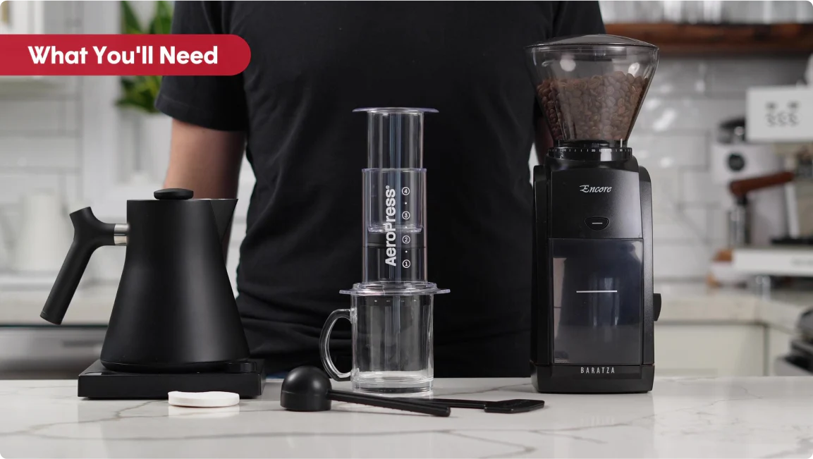 What you’ll need to brew: AeroPress, Kettle, Mug, Pre-Ground Coffee