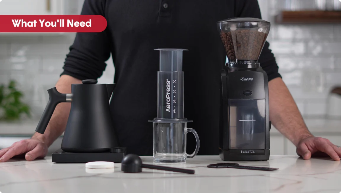 What you’ll need to brew: AeroPress, Kettle, Mug, Pre-Ground Coffee