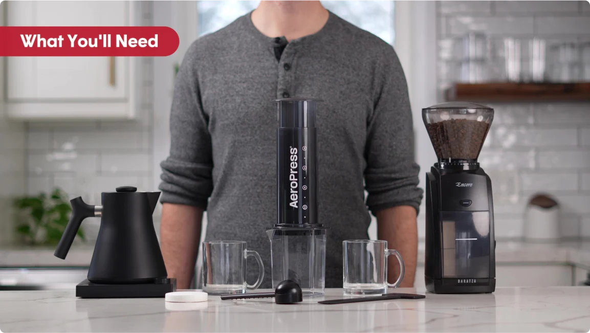 What you’ll need to brew: AeroPress, Kettle, Mug, Pre-Ground Coffee